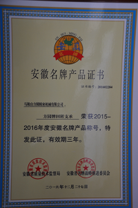 2016安徽省名牌產(chǎn)品證書(shū)
